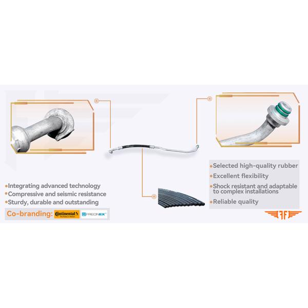 Our air conditioning ducting is primarily constructed of aluminum, combined with highly flexible hoses, allowing it to bend and move easily in tight spaces. It seamlessly integrates with other components of the vehicle's air conditioning system, making installation a breeze. We use high-quality rubber or synthetic materials that are resistant to pressure, corrosion, and aging, and incorporate reinforced braiding to ensure excellent pressure, vibration, and weather resistance, making it easily resistant to complex road conditions and extreme temperatures. We understand that safety is paramount and strictly adhere to industry standards to provide you with a long-lasting, stable, safe, and worry-free air conditioning system.